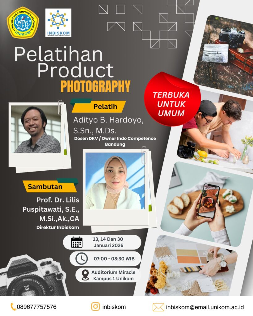 Kegiatan ini bisa diikuti oleh Bapak/Ibu Dosen dan Staff UNIKOM yang sudah punya usaha. Yuk gabung—sekalian upgrade skill Photo Produk 😉